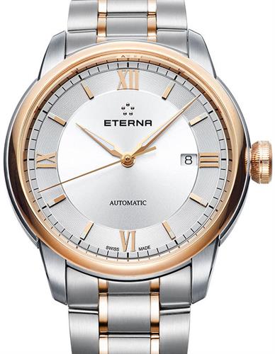 Eterna Contemporary Adventic Date watch model 2970.53.17.1703. Powered by Swiss automatic movement. Rose gold PVD plated accents on stainless steel case and bracelet. Silver color dial with date calendar and Roman numerals.