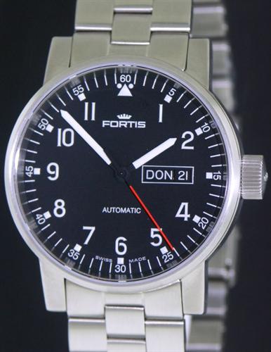 Fortis Spacematic model 623.10.71 M with a 40mm satin finish solid stainless steel case and matching bracelet. Jet black dial with contrasting white numbers and a bright red second hand. 100m water resistant