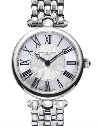 Frederique Constant Art Deco Collection. Model FC-200MPW2AR6B. Round stainless steel case with bracelet. Swiss quartz movement. Sapphire crystal. Mother-of-Pearl textured silver color dial with Roman numerals.