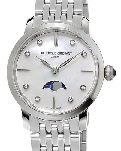 Frederique Constant Slim Line Collection. Model FC-206MPWD1S6B.30mm round stainless steel case with bracelet. Swiss quartz movement. Sapphire crystal. Silver color Mother-of-Pearl dial with diamond markers and moon-phase indicator.