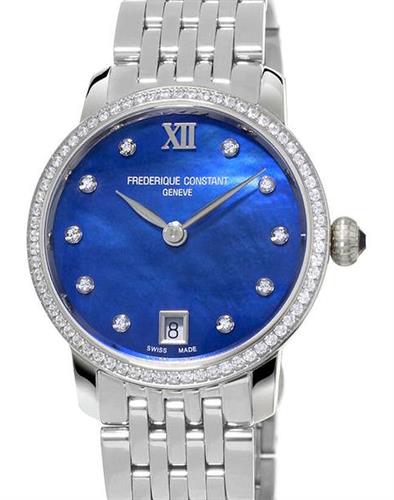 Frederique Constant Slim Line Collection. Model FC-220MPND1SD26B. 30mm round stainless steel case with bracelet and 78 diamonds (.59CT) on the bezel. Swiss quartz movement. Sapphire crystal. Gorgeous blue Mother-of-Pearl dial with diamond markers and date calendar.