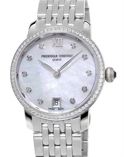 Frederique Constant Slim Line Collection. Model FC-220MPWD1SD26B. 30mm round stainless steel case with bracelet and 78 diamonds (.59CT) on the bezel. Swiss quartz movement. Sapphire crystal. White Mother-of-Pearl dial with diamond markers and date calendar.
