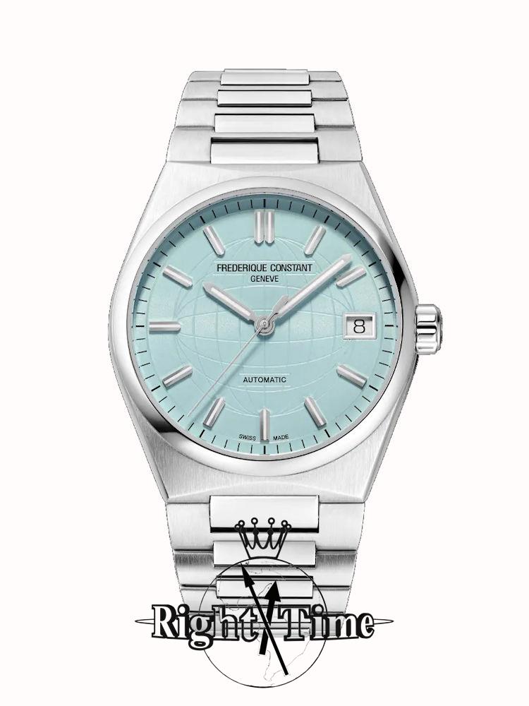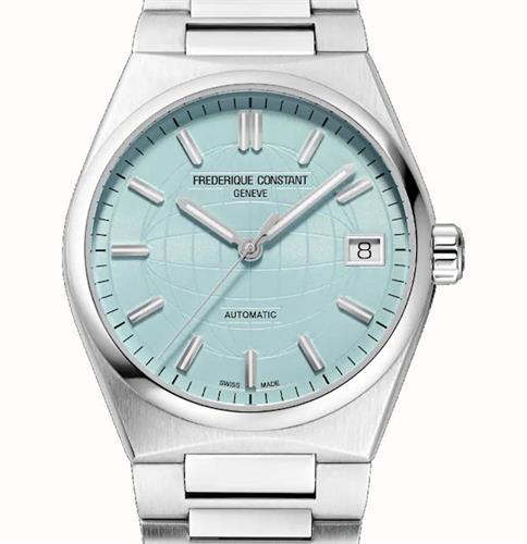 Frederique Constant Highlife COSC Collection. Model FC-303LB2NH6B. Swiss automatic certified COSC movement. Stainless steel 34mm case. Blue color dial with an embossed globe pattern, date calendar, luminous hands and markers. Steel bracelet