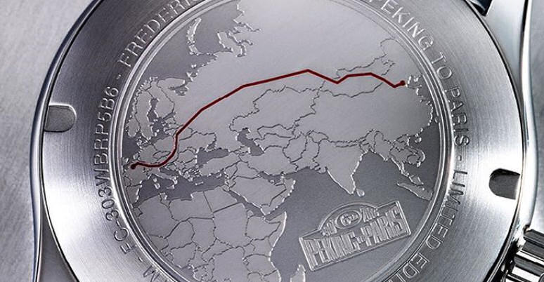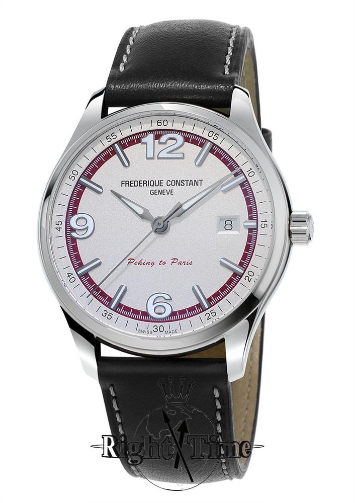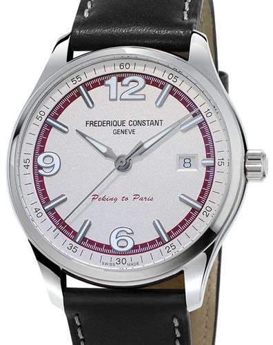 Frederique Constant Vintage Rally Peking to Paris watch. Model FC-303WBRP5B6. Limited Edition. Swiss automatic movement with date. Stainless steel case with Peking to Paris route map engraved on the back. Silver dial with burgundy ring and luminous hands and indexes. Dark grey leather band.