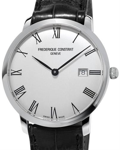 Frederique Constant Slim Line Collection. Model FC-306MR4S6. Solid stainless steel case with leather band. Swiss automatic movement. Sapphire crystal. Silver color dial with date calendar and Roman numerals.