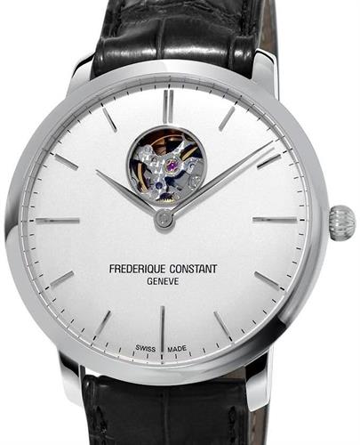 Frederique Constant Slimline Collection. Model FC-312S4S6. Swiss automatic movement. Stainless steel slim round case. Silver color dial with signature Heart Beat aperture at 12 o`clock. Black leather watch strap.