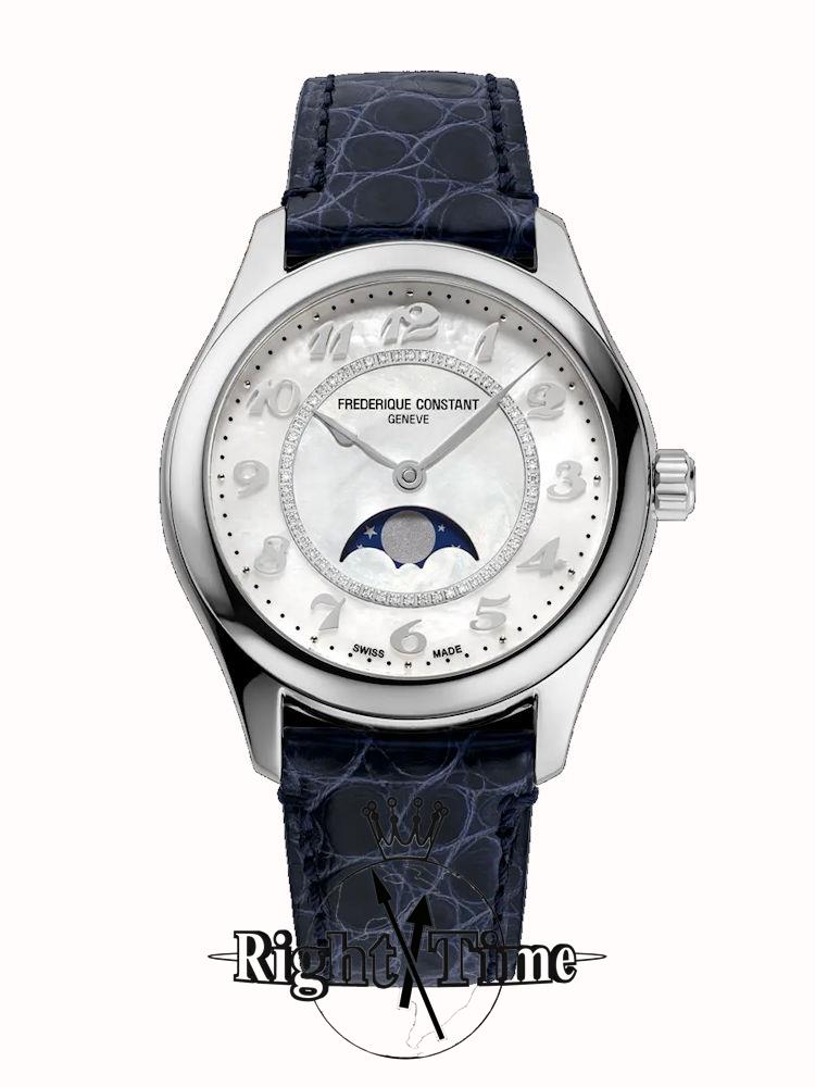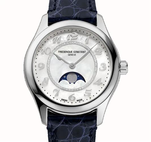 Frederique Constant Elegance Collection. Model FC-331MPWD3B6. Swiss automatic movement. Stainless steel case. Blue alligator leather band. White Mother-of-Pearl dial with moon-phase window display, Arabic numerals, and 56 diamonds (07 carat).