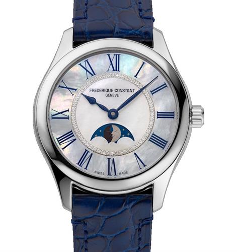 Frederique Constant Elegance Collection. Model FC-331MPWND3B6 Luna. Swiss automatic movement. Stainless steel case. Blue alligator leather band. Mother-of-Pearl dial with moon-phase window display, Arabic numerals, and 56 diamonds (07 carat).