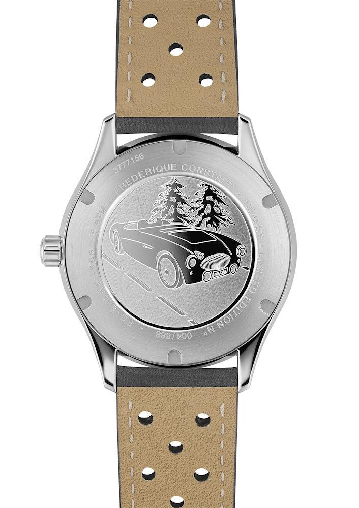 Frederique Constant Vintage Rally Healey Automatic watch. Model FC-345HGS5B6. Limited Edition of 888 pieces. Swiss automatic movement. Stainless steel case. Gray dial with white ring, date, small seconds sub-dial and luminous hands and indexes. Gray leather band.