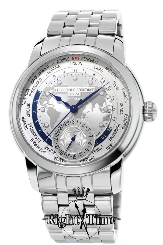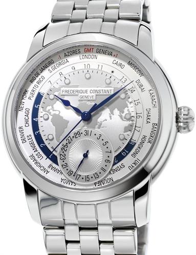 Frederique Constant Classic Manufacture Collection. World time model FC-718WM4H6B. Swiss automatic in-house FC700 movement with Cotes de Geneve and Collimacon patterns. Silver color textured dial with date pointer hand and world map. Polished stainless steel case with bracelet.
