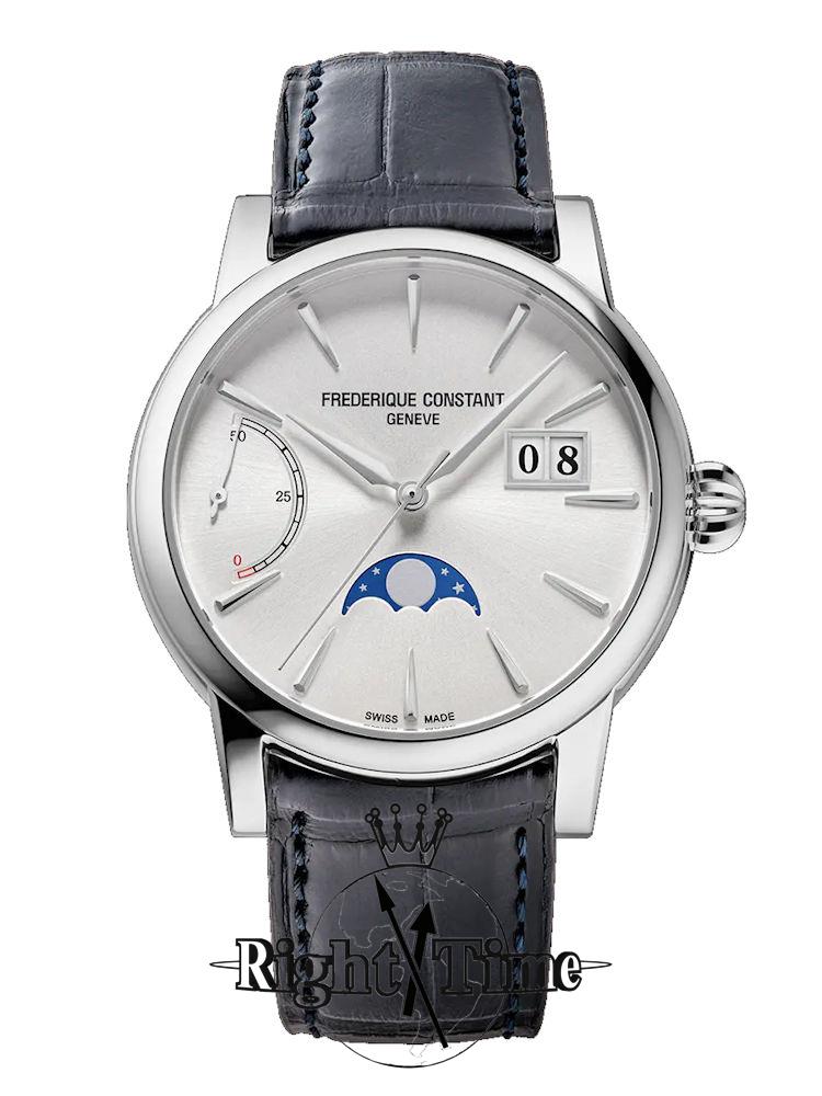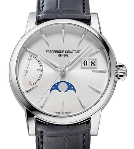 Frederique Constant Manufacture Classic Power Reserve Big Date. Model FC-735S3H6. Swiss automatic movement. Stainless steel case with blue leather band. Silver color dial with big-date calendar, moon-face window, and power reserve hand.