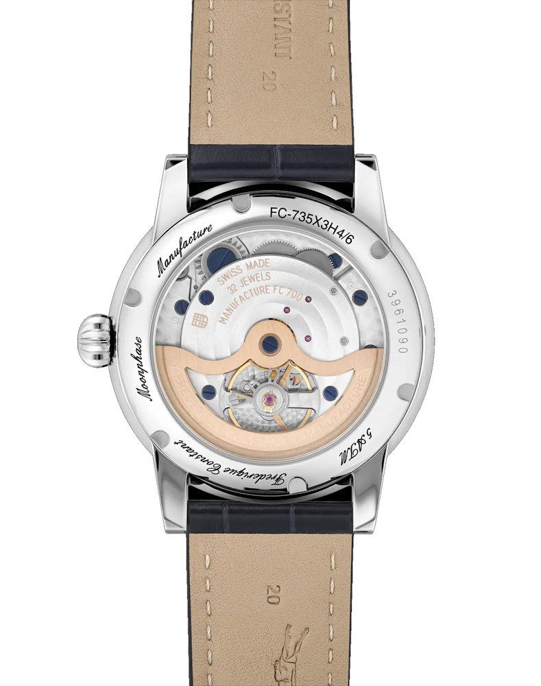 Swiss made Mechanical Automatic (Powered by wrist motion). 32 jewels. Frederique Constant Cal. FC-735.