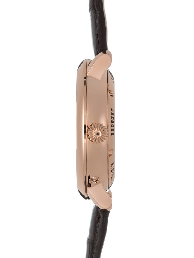 Frederique Constant Slim Line Collection. Model FC-775V4S4. Stainless steel rose gold plated round case. Swiss automatic movement. Sapphire crystal. White color dial with triple-calendar: date pointer hand, day-of-week pointer hand, month pointer hand, and moon-phase indicator. Brown alligator leather band.