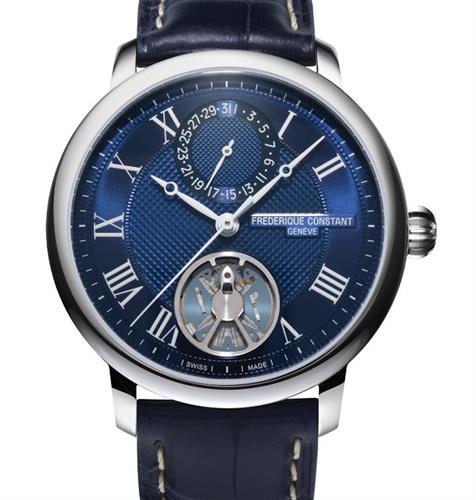 Frederique Constant Slimline Monolithic Manufacture Collection. Model FC-810MCN3S6. Stainless steel round case. Swiss automatic movement. Sapphire crystal. Blue color dial with date pointer hand and "Open Heart" showing the oscillator at 6 o`clock position. Navy blue alligator leather band. Limited Edition of 810 pieces.