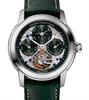 Frederique Constant Tourbillon Perpetual Calendar Manufacture. Model FC-975DGR4H6. Limited Edition of 10 pieces. US Exclusive. Powered by automatic FC-975 in-house movement with heartbeat and tourbillon. Green skeletonized dial. Steel case with green alligator strap.