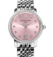 Frederique Constant Classics Slim Line Collection. Model FC-220LPD1SD26B. 30mm round stainless steel case with bracelet and 68 diamonds on the bezel and 10 diamond indexes. Swiss quartz movement. Sapphire crystal. Pink dial with sunray finishing and date calendar.