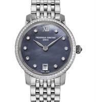 Frederique Constant Slim Line Collection. Model FC-220MPWD1S26B. 30mm round stainless steel case with bracelet. Swiss quartz movement. Sapphire crystal. White color Mother-of-Pearl dial with diamond markers and date calendar.