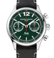 Frederique Constant Vintage Rally Healey Collection. Automatic chronograph watch. Model FC-397HDGR5B6. Limited Edition of 700 pieces. Swiss automatic movement. Stainless steel case. Green color dial. Black leather band.