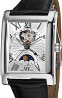 Frederique Constant Carree Collection. Model FC-335MS4MC6. Swiss automatic movement. Stainless steel tank style case. Silver color dial with signature Heart Beat aperture at 12 o`clock, date pointer hand, and moon phase calendar at 6 o`clock. Black leather band.