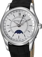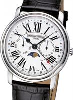 Frederique Constant Classic Collection. Model FC-270M4P6. Swiss quartz movement. Stainless steel case. Silver color dial with Roman numerals. Day and Date sub-dial indicators, Week number pointer hand, and Moon-phase. Black leather band.