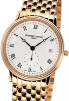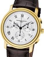 Frederique Constant Classic Collection. Model FC-292MC4P5. Swiss quartz chronograph movement. Stainless steel gold plated case. Silver color dial with Roman numerals. Brown leather band.