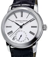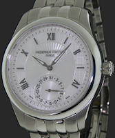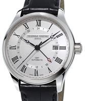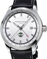 Frederique Constant Classic Collection. Model FC-350MC5B6. Swiss automatic movement. Stainless steel round case. Silver color textured dial with date calendar, second-time-zone hand, and Roman numerals. Black leather band