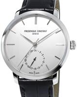 Frederique Constant Manufacture Slimline Collection. Model FC-710S4S6. Swiss automatic movement. Silver color dial with date pointer hand. Steel case. Black leather band.