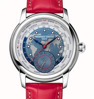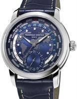 Frederique Constant Classic Manufacture Collection. World time model FC-718NWM4H6. Swiss automatic in-house FC700 movement with Cotes de Geneve and Collimacon patterns. Navy blue dial with white luminous indexes, date pointer hand and world map. Polished stainless steel case. Blue alligator leather strap on deployant clasp.