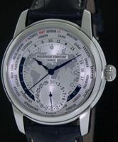 Frederique Constant Classic Manufacture Collection. World time model FC-718WM4H6B. Swiss automatic in-house FC700 movement with Cotes de Geneve and Collimacon patterns. Silver color textured dial with date pointer hand and world map. Polished stainless steel case with bracelet.