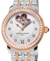 Frederique Constant Ladies Automatic World Heart Federation. Model FC-303WHF2PD2B3. Swiss automatic movement. Stainless steel round case with rose gold tone bezel and 58 diamonds (.84ct) on dial and bezel. Silver color textured dial with diamond markers. Stainless steel bracelet with rose gold tone accents.