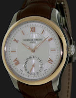 Frederique Constant Heart Beat Manufacture Collection. Model FC-945MC4H9. Limited Edition of 888 pieces. Swiss automatic movement with second time zone indicator. 18kt solid rose gold round case. Silver color textured dial with "Heart Beat" at 6 o`clock, moon-face calendar, 24-hours hand, and date pointer hand-indicators. Brown leather band.