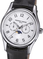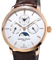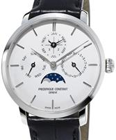 Frederique Constant Slim Line Collection. FC-775S4S6. Stainless steel round case. Swiss automatic movement with perpetual calendar. Sapphire crystal. White color dial with triple-calendar: date pointer hand, day-of-week pointer hand, month pointer hand, and moon-phase indicator. Black alligator leather band.