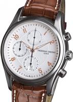 Frederique Constant Runabout Collection. Model FC-392RV6B6. Swiss automatic chronograph movement. Stainless steel round case. Silver color textured dial with date calendar. Brown leather band.