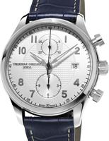 Frederique Constant Runabout Collection. Model FC-393RM5B6. Swiss automatic chronograph movement. Stainless steel round case. Silver color textured dial with date calendar. Blue leather band.