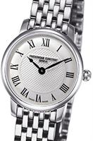 Frederique Constant Slim Line Collection. Model FC-200MCS6B. Small 25mm round stainless steel case with bracelet. Swiss quartz movement. Sapphire crystal. Silver color guilloche textured dial with Roman numerals.