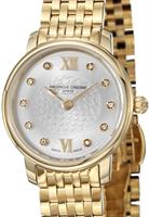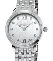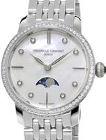 Frederique Constant Slim Line Collection. Model FC-206MPWD1S6B.30mm round stainless steel case with bracelet. Swiss quartz movement. Sapphire crystal. Silver color Mother-of-Pearl dial with diamond markers and moon-phase indicator.