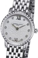 Frederique Constant Slim Line Collection. Model FC-200WHDS5B. Small 25mm round stainless steel case with bracelet. Swiss quartz movement. Sapphire crystal. Silver color guilloche hearts textured dial with diamond markers.
