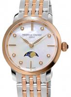 Frederique Constant Slim Line Collection. Model FC-206MPWD1S2B. 30mm round stainless steel case with bracelet and rose gold plated accents. Swiss quartz movement. Sapphire crystal. Silver color Mother-of-Pearl dial with diamond markers and moon-phase indicator.