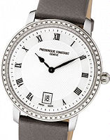 Frederique Constant Slim Line Collection. Model FC-220MPBD1S26B. 30mm round stainless steel case with bracelet. Swiss quartz movement. Sapphire crystal. Grey color Mother-of-Pearl dial with diamond markers and date calendar.