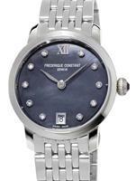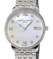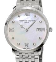Frederique Constant Slim Line Collection. Model FC-220MpWD3S6B. 36mm round stainless steel case with bracelet. Swiss quartz movement. Sapphire crystal. Silver color Mother-of-Pearl dial with diamond markers and date calendar.