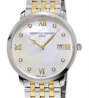 Frederique Constant Slim Line Collection. Model FC-220MPWD3S3B. 36mm round stainless steel case with bracelet and yellow gold plated accents. Swiss quartz movement. Sapphire crystal. Silver color Mother-of-Pearl dial with diamond markers and date calendar.
