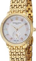 Frederique Constant Slim Line Collection. Model FC-235MPWD1S5B. Small 28.5mm round stainless steel gold plated case with bracelet. Swiss quartz movement. Sapphire crystal. Silver color guilloche textured dial with small seconds sub-dial at 6 o`clock position.