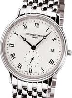 Frederique Constant Slim Line Collection. Model FC-245M4S6B. Round stainless steel case with bracelet. Swiss quartz movement. Sapphire crystal. Silver color guilloche textured dial with Roman numerals, date calendar, and small seconds sub-dial.