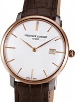Frederique Constant Slim Line Collection. Model FC-306V4S9. 18K solid rose gold round stainless case. Swiss automatic movement. Sapphire crystal. Silver color dial with date calendar. Brown leather band.