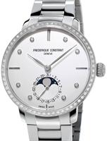 Frederique Constant Slim Line Collection. Model FC-703SD3SD6B. Stainless steel round case with diamond bezel. Swiss automatic movement. Sapphire crystal. Silver color dial with date pointer hand and moonphase. Stainless steel bracelet.