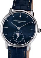 Frederique Constant Slim Line Collection. Model FC-705NR4S6. Stainless steel round case. Swiss automatic movement. Sapphire crystal. Blue color dial with date pointer hand and moonphase. Blue leather strap.