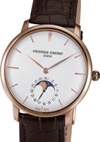 Frederique Constant Slim Line Collection. Model FC-705V4S4. Stainless steel rose gold plated round case. Swiss automatic movement. Sapphire crystal. White color dial with date pointer hand and moonphase. Brown alligator leather band.
