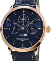 Frederique Constant Slim Line Collection. Model FC-775N4S4. Stainless steel rose gold plated round case. Swiss automatic movement. Sapphire crystal. Blue color dial with triple-calendar: date pointer hand, day-of-week pointer hand, month pointer hand, and moon-phase indicator. Blue alligator leather band.