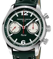 Frederique Constant Vintage Rally Healey Collection. Automatic chronograph watch. Model FC-397HGR5B6. Limited Edition of 2888 pieces. Swiss automatic movement. Stainless steel case. Green color dial with white color sub-dials. Green leather band.