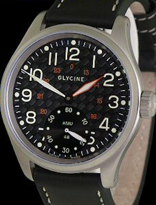 Glycine KMU 48 Limited Edition 2009. ETA 6498-1 manual winding movement with 17 jewels. Large 48mm stainless steel case with a satin finish. Black carbon fiber dial with Arabic luminous numbers. Glycine logo on crown. K1 mineral glass crystal. Comes with one black leather strap and one tan leather strap. Individually numbered.